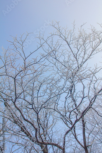 Obraz premium snow-covered tree branches and blue cloudless winter sky