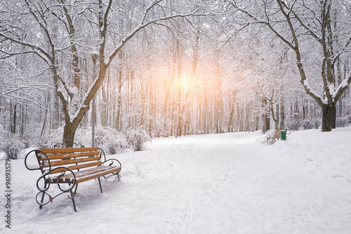 © pilat666, Obraz premium Snow-covered trees and benches in the city park