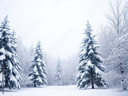 Naklejka premium Snow-covered trees in a winter wonderland with falling snowflakes, trees, snowfall, tranquil
