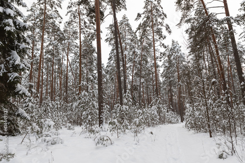 © Nauris, Fototapeta premium snow covered trees in the forest cloudy day cool tones mature pine trees Latvian woods