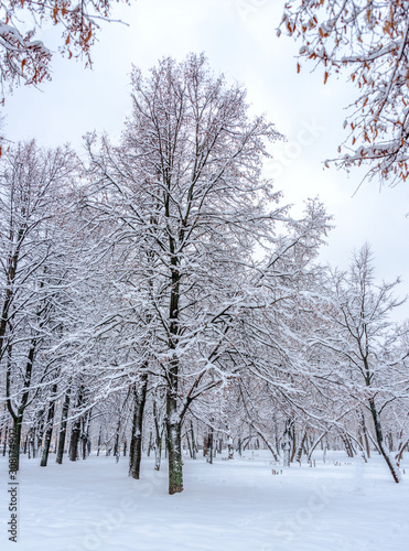 Fototapeta premium Snow-covered trees in the park