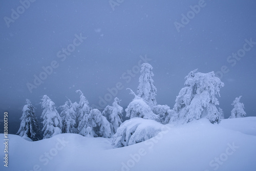 © Ivan Kmit, Fototapeta premium Snow covered trees in winter mountains under overcast sky. Minimal snowy landscape with calm frozen nature