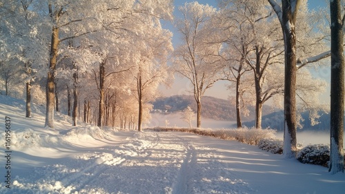 Fototapeta premium Snow covered trees line a winter pathway towards a distant mountain