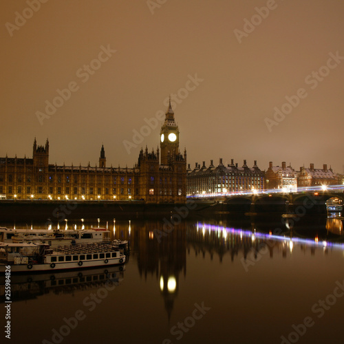 © Sampajano, Naklejka premium Snow covered Westminster Palace at dawn over dark grey sky