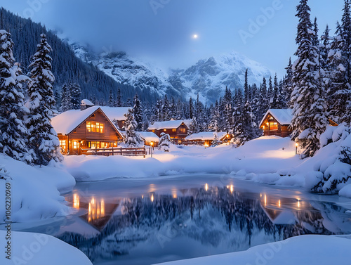 Naklejka premium Snow-Covered Winter Village at Dusk