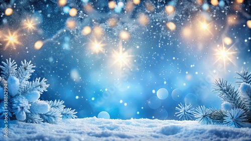 © Kukar Studio, Naklejka premium Snow-covered winter wonderland with falling snowflakes, blue background, blurred lights, and a cozy holiday atmosphere