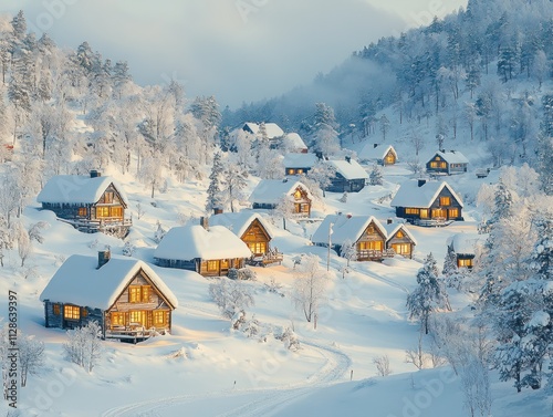 Naklejka premium Snow-covered wooden cabins glow warmly on a hillside at twilight.