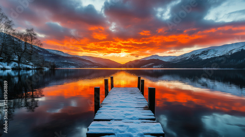 Naklejka premium Snow-covered wooden pier leading to a fiery winter sunset over a tranquil lake for scenic landscape and travel inspiration