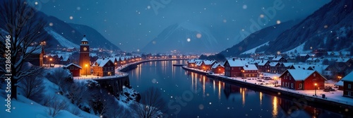 Fototapeta premium Snow-dusted Bryggen, Bergen at twilight Christmas lights sparkle on snow-covered roofs , village, Bryggen