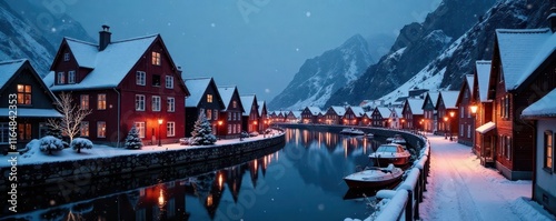 Fototapeta premium Snow-dusted Bryggen, Bergen Christmas lights gleam on historic, snow-covered buildings at twilight , Norway travel, snow-covered roofs, magical