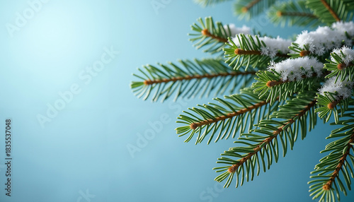 Obraz premium Snow-dusted pine branches against light blue background with soft focus