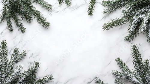 Obraz premium Snow Dusted Pine Branches Frame White Marble Background