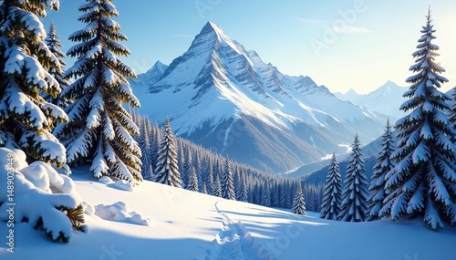 Fototapeta premium Snow-dusted pine forest, mountain peak, deep shadows, evergreen, winter