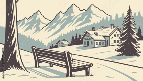 © Vector_Di-cut_Sets, Fototapeta premium snow dusted wooden bench overlooks serene mountain landscape with cozy cabin