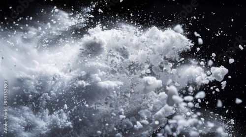 © Ksenia, Obraz premium Snow explosion isolated on black background. Abstract dynamic cloud of white dust particles dispersing overlay design. Winter storm element creative collage.