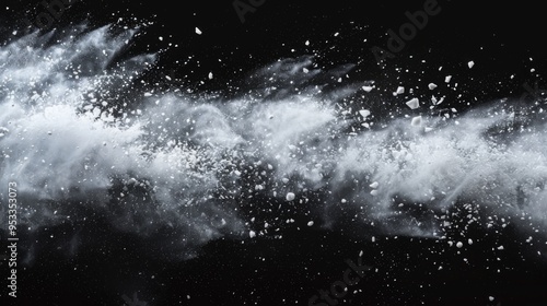 © Ksenia, Obraz premium Snow explosion isolated on black background. Abstract dynamic cloud of white dust particles dispersing overlay design. Winter storm element creative collage.