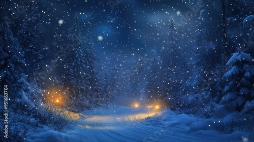© Ahmad M., Naklejka premium snow falling at night in a snowy dark forest with lights and stars