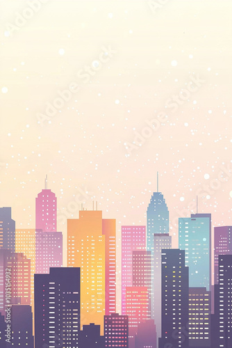 Fototapeta premium Snow falling on pastel city skyline at sunset