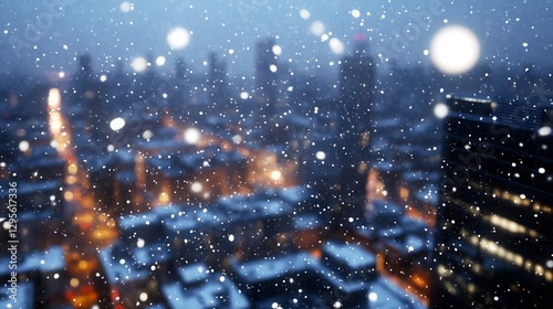 Obraz premium Snow falling over a vibrant city at dusk with blurred cityscape background :...