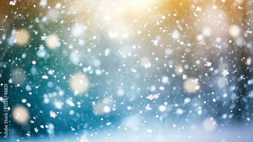© PhotoVibe, Obraz premium Snow falls gently in this wallpaper. The sky is a mix of white, teal, and blue. Many snowflakes float in the air. This peaceful scene shows the beauty of winter.