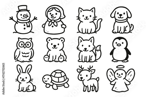 Fototapeta premium Snow Figures set of icons in doodle hand-drawn vector style: snowman, snowwoman, snow cat, snow dog, snow owl, snow bear, snow fox, snow penguin, snow rabbit, snow turtle, snow