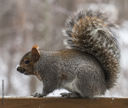 Obraz premium snow flakes on the nose of a grey squirrel with big fluffy tail