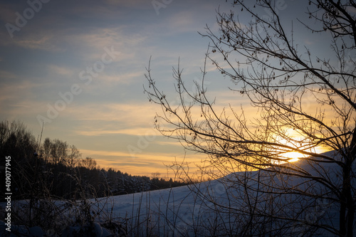 © Павел Курчиков, Obraz premium Snow forest during sunrise; Bright rays of the sun cut through frozen branches and tree trunks