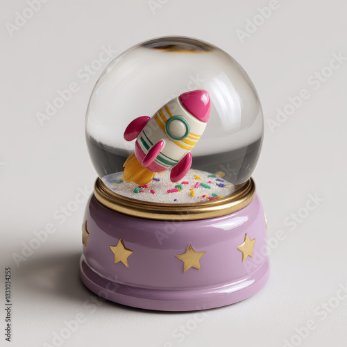 Obraz premium Snow globe with colorful rocket inside on decorative base.