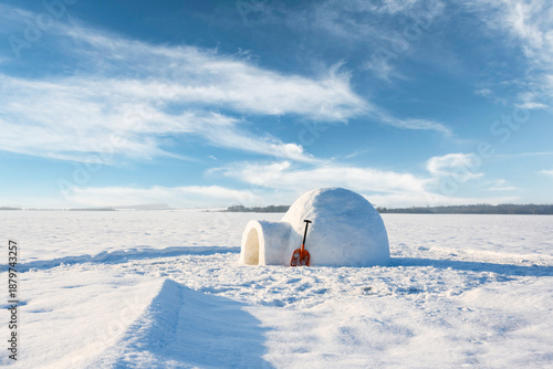 © Ivan Kmit, Fototapeta premium Snow igloo in the winter field under blue sky with fluffy clouds. Landscape photography