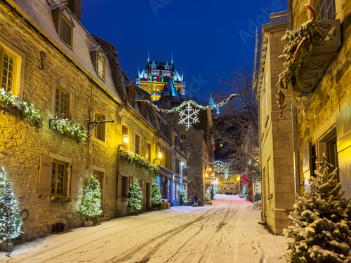 Obraz premium Snow in December in the festive decorated streets of Old Quebec City, Quebec,Canada
