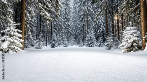 © siraphol, Fototapeta premium Snow laden pine forest glowing with soft moonlight, serene winter scene