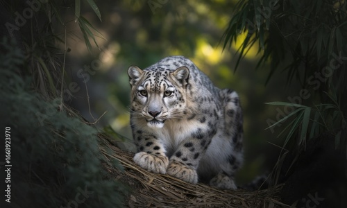 © ELVIRADANAM, Obraz premium Snow leopard alert, jungle setting