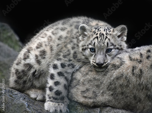 © breakingthewalls, Obraz premium Snow leopard cub resting on mother with blue eyes