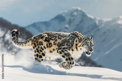 Obraz premium Snow leopard in mid-pounce against a snowy mountain backdrop, exuding wild...