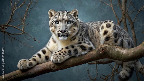 © Rezaul, Fototapeta premium Snow Leopard is on a barred tree branch solid color backdrop