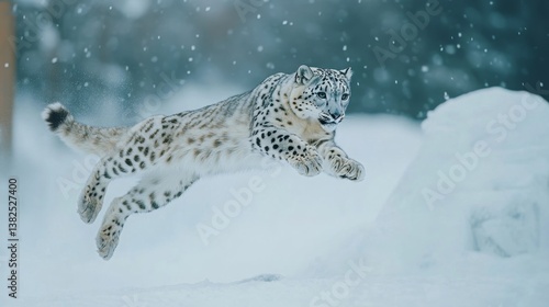 © DG, Obraz premium Snow Leopard Leaping Through Snowy Landscape in Winter Wonderland