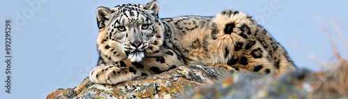 Obraz premium Snow leopard perched on rocky outcrop in a high-altitude environment, elusive...