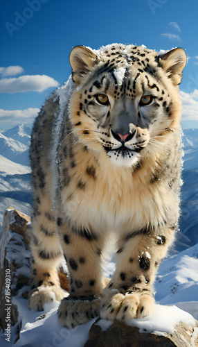 © Wazir Design, Obraz premium Snow leopard portrait on the background of snowcapped mountains
