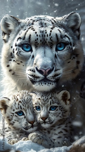 Obraz premium Snow leopard protecting her two cubs during snowfall