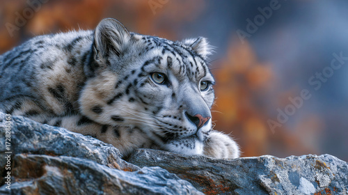 © MuhammadBilal, Fototapeta premium Snow Leopard Resting on Rocky Mountain Habitat