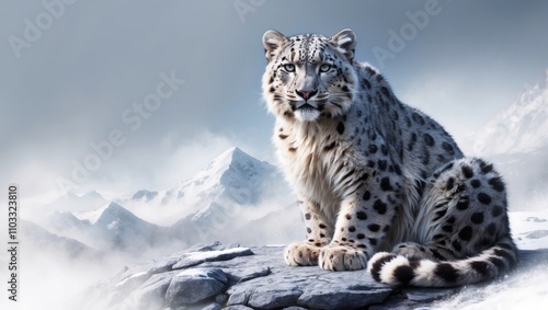 Naklejka premium Snow leopard rests on rocky ledge amid misty mountain landscape