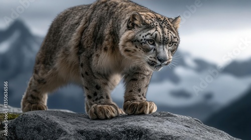 © Oxi, Obraz premium Snow Leopard Stalking Prey on Rocky Outcrop Against Dramatic Mountain Landscape in Cold Environment