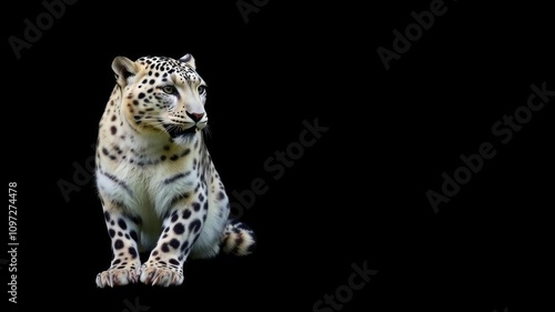 Obraz premium Snow leopard standing alone in a majestic pose on a dark black background,...