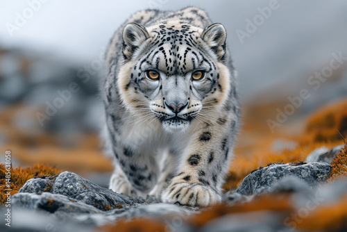 © Nigina, Fototapeta premium Snow leopard striding across rocky terrain.