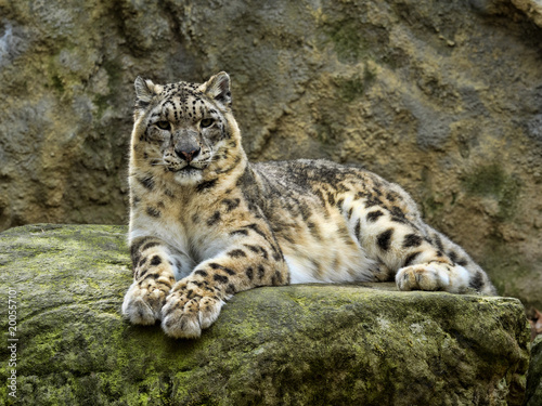 Naklejka premium Snow leopard, Uncia ucia, like to lie on boulders