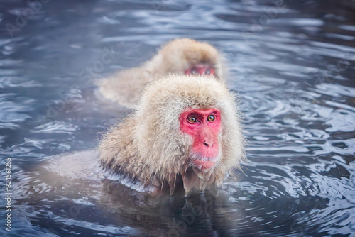 Naklejka premium Snow Monkey Japanese Macaque baithing in natural hot spring Yamanouchi Japan
