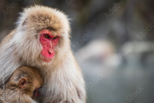 © Blanscape, Naklejka premium Snow monkey mom and baby at Jigokudani Park