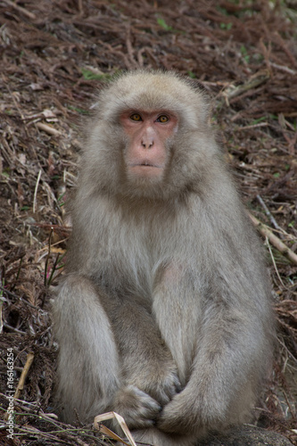 © tloventures, Fototapeta premium Snow monkey or Japanese macaque sitting on hillside facing the camera.
