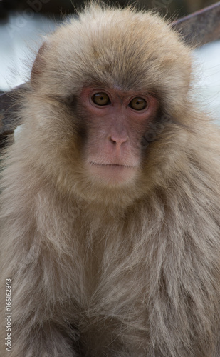 © tloventures, Naklejka premium Snow monkey or Japanese macaque with its pink face looking at the camera. Shallow depth of field.