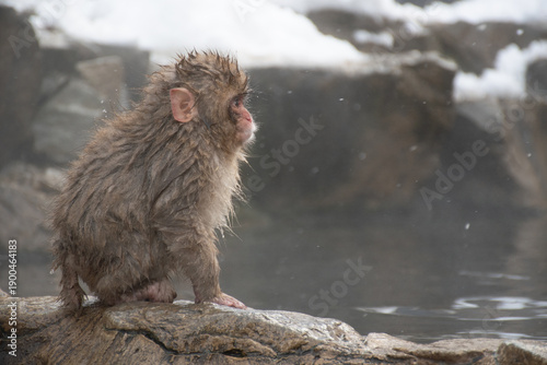 Fototapeta premium 地獄谷野猿公苑の温泉上がりの野生の子猿の横顔 snow monkey park